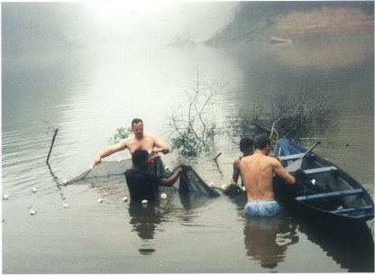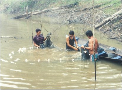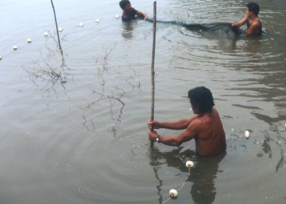بخش كوچك صيد از به دام انداختن ماهي هايي كه در بين ريشه ها و شاخه هاي زير آب مخفي مي شوند حاصل ميشود( با ترساندن آنها با نور فلاش و به وسيلهي يك تور گرد كه به يك دسته چوبي بلند متصل است ).
