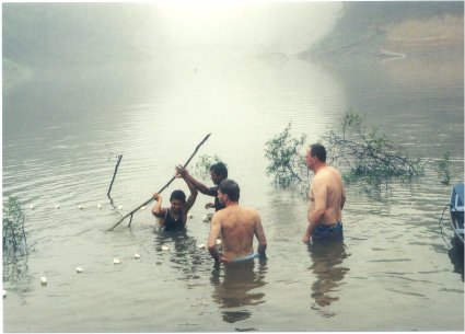ماهي هايي كه طي اين مانور به دنبال سرپناهي امن ميگردند بدون هيچ راه گريزي محاصره ميشوند . پس از اينكه منطقهي مورد نظر كاملا بسته شد و هيچ راهي براي فرار ماهيها باقي نماند آنها چوبهاي فروبرده در زمين را در ميآورند.